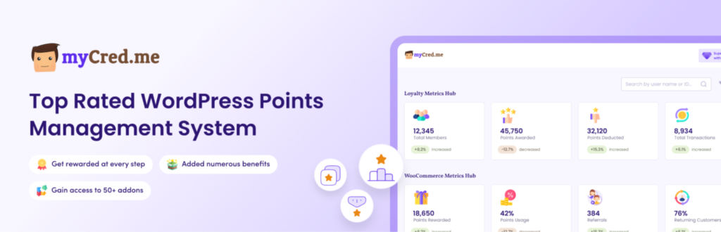 myCred is a powerful WordPress gamification and loyalty plugin that allows you to create a complete points-based rewards system for your website or WooCommerce store. It enables you to reward users with points for various actions—such as purchases, logins, comments, and referrals, helping increase engagement, retention, and repeat visits.